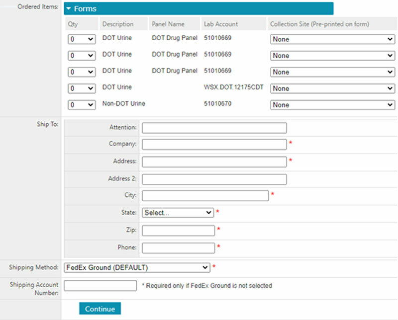 5. Enter the number of forms needed and select a collection site to be pre-printed on the form or leave as none to use at any collection site.