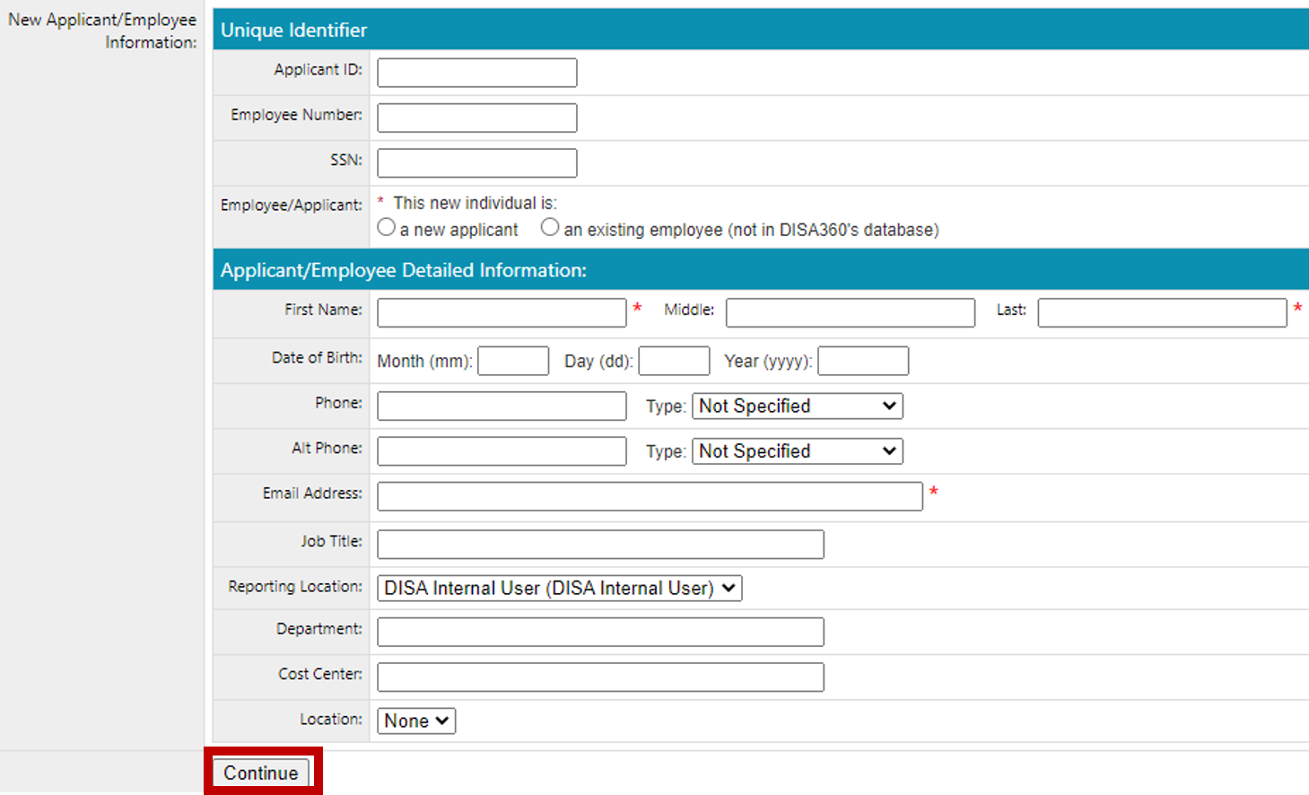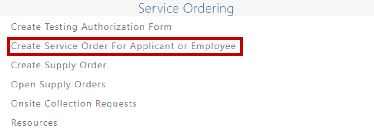If the employee is NOT listed in DISA360, you need to add the employee into DISA360 first. From the home page, under “Service Ordering” click “Create Service Order for Applicant or Employee” and enter all the applicable information. Be sure their email is correct as this is how they will receive the training information from DISA.
