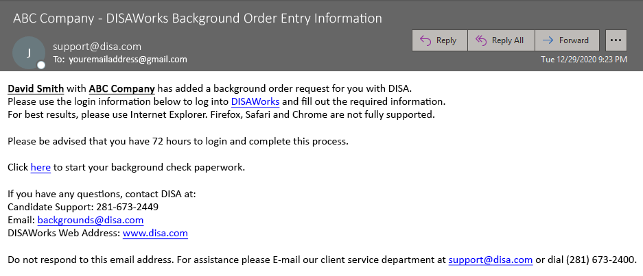 If you're a candidate who has been asked to complete a background screen inside of DISAWorks, you MUST click the link inside the email sent to you from support@disa.com to start your background check. The subject line will include the company that ordered the background screen, and the email will reference the individual that ordered it.
