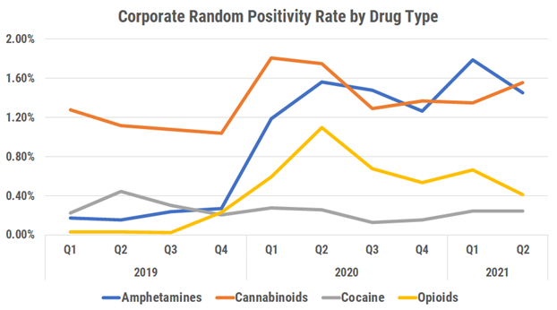 Additionally, amphetamine positivity rates have been higher than marijuana in two of the last four quarters for corporate employee random drug testing with no signs of slowing down.