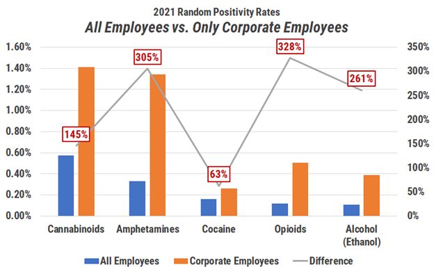 When comparing corporate employee positivity rates to all employees, corporate employees are up to 4x more likely to abuse opioids or amphetamines.