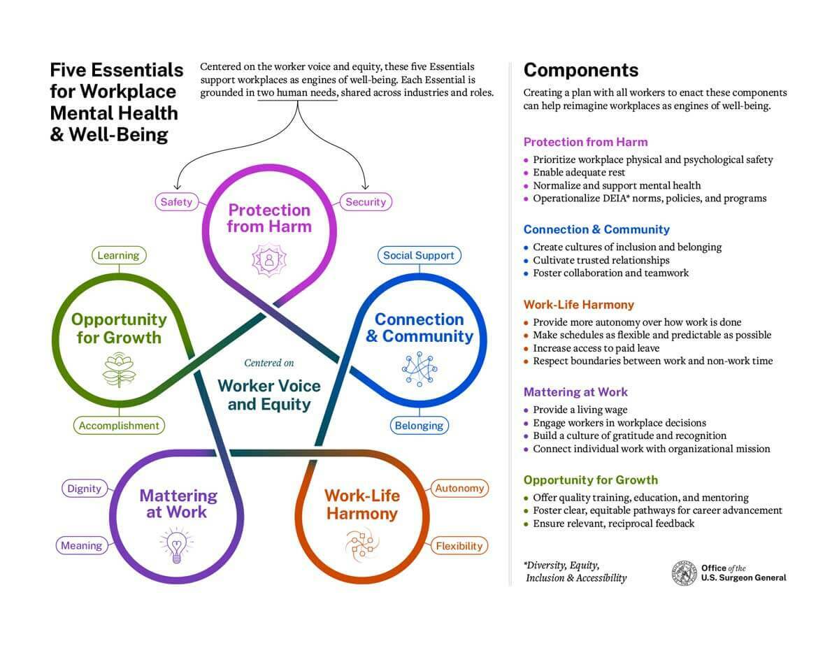 Promoting mental health in the workplace isn’t just about supporting employees—it’s also good for the bottom line. The Surgeon General’s Framework for Mental Health and Well-Being in the Workplace urges organizations to protect workers from harm, create connections between colleagues, show workers that they are valued, and give them space for their lives outside of work. These changes can foster a positive workplace culture and have a significant impact on employee morale and productivity.